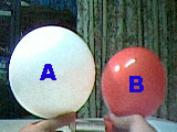 1. Fill a balloon with air until it has about three forth of the total volume. (this is the Goliath balloon) 2. Press the mouth of the Goliath balloon and place it in one of the extremities of a rubber tube. Don't let the air escape. 3. Fill the other balloon with air until it has about a quarter of the total volume. (this is the David balloon) 4. Press the mouth of the David balloon and link it to the other extremity of the tube. Don't let the air escape. 5. Simultaneous, with the two hands, unpress the mouths of the balloons and verify who wins. Was it David or Goliath? |