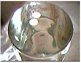 1. With the awl make two paper circles. 2. Pour water to the glass, filling about 3/4 of the total volume of it. 3. Place the two paper circles in the center of the glass. 4. You can verify that the circles move in the glass border direction. 5. With the toothpick move them to the water surface center. 6. You can verify, again, that the circles continue to move in the border direction. 7. Remove the paper circles from the water. 8. Add more water to the glass until it has a surface above the glass limit. (the addition of the last drops should be made carefully) 9. Place the two circles in the center of the water surface. 10. You can verify that the circles don't move to the glass border. (the previous effect was canceled) 11. With the help of the toothpick move the circles for the border of the glass. (move them carefully so the water doesn't overflows) 12. After freeing them, you can observe that they move in the direction of the water surface center. (the reverse effect appeared) |