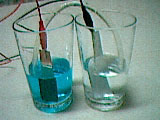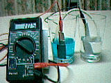 1. Attention! During the execution of this experiment you should protect your hands with gloves and eyes with glasses. 2. Begin preparing an aqueous solution of sodium chloride for the saline bridge. 3. Pour the aqueous solution of salt in a rubber tube and cover the other tube extremities with cotton. (the cotton should be placed to don't allow the solution of NaCl to come out. It shouldn't be visible any air bubble in the tube) 4. Fill 2/3 of the glasses total volume with distilled water. 5. Pour a spoon of copper sulphate in the first glass and a spoon of zinc sulphate in the second. Mix the solutions well. 6. Using a conductive string with crocodiles in the extremities, link the zinc electrode to the black string (COM) of the voltmeter. 7. With the other string, link the red string of the voltmeter to the copper electrode. 8. Dip each one of the extremities of the saline bridge in the solutions of zinc and copper sulphate. (the system doesn't work if the saline bridge is not well dived) 9. Dip the zinc electrode in the zinc sulphate solution. (be careful with the zinc sulphate because it is nocive) 10. Dip the copper electrode in the copper sulphate solution. (you can verify that the voltmeter presents a potential close to 1,1 V) |