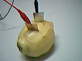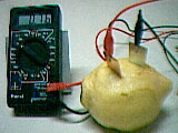 1. Using an electric string link the voltmeter red pole string to the copper electrode. 2. With other string link the voltmeter black pole (COM) to the zinc electrode. 3. Stick the two electrodes in the lemon. (The electrodes shouldn't touch each other. You can verify that the voltmeter indicates a potential near 1 V. You can use this energy source to supply a digital clock) |