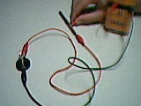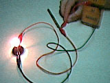 1. Set up a system similar to the described in the experiment Serial circuit. 2. Place a mine pencil in water during one day. Then remove half of the wood that surrounds the mine. 3. Link the pencil mine extremity to the negative pole of the battery with one electric string. 4. Link another string to the lamp support and use the other extremity to slide on the mine. 5. Connect the other support link to the positive pole of the battery and slide the free extremity on the mine close to the other linked string. (you can verify that the lamp shines intensely) 6. Begin to move the free string slowly along the mine. The moving string should be in permanent contact with the mine. (you can verify that the intensity of the light is lowering progressively, in other words, the resistance to the movement of the electrons is increasing) 7. Move the sting in the contrary direction to before. (then you can verify that the lamp begins again to shine with higher intensity) |